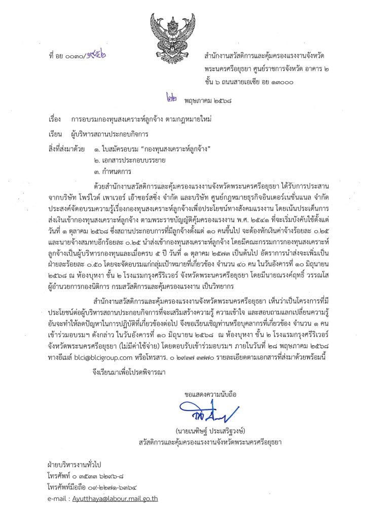 และ สำนักงานสวัสดิการและคุ้มครองแรงงาน จังหวัดพระนครศรีอยุธยา